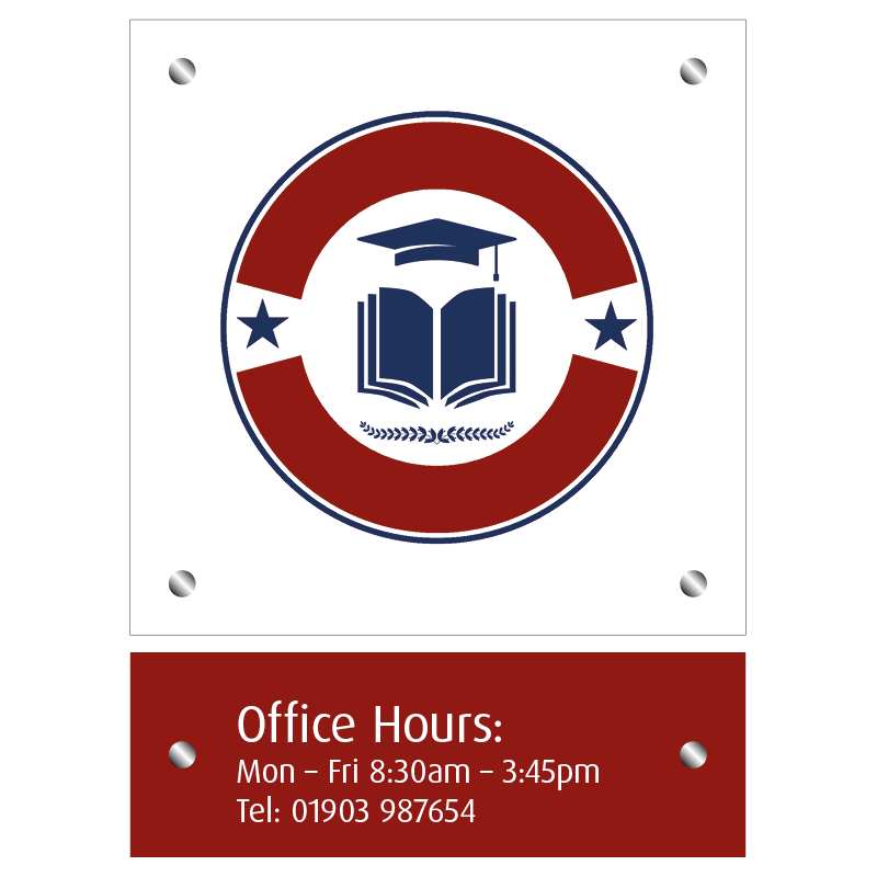 Each sign is made with a header panel and any number of rectangular panels below. The 100 mm (H) × 300 mm (W) panels feature white text with a choice of five standard coloured backgrounds — or you can suggest your own. The 300 mm (H) × 300 mm (W) header panel comes with a white background and your school logo applied.
