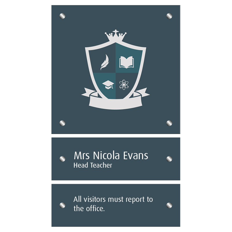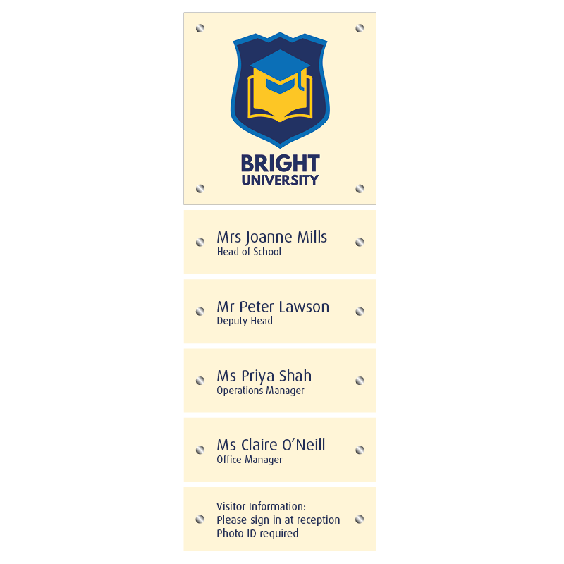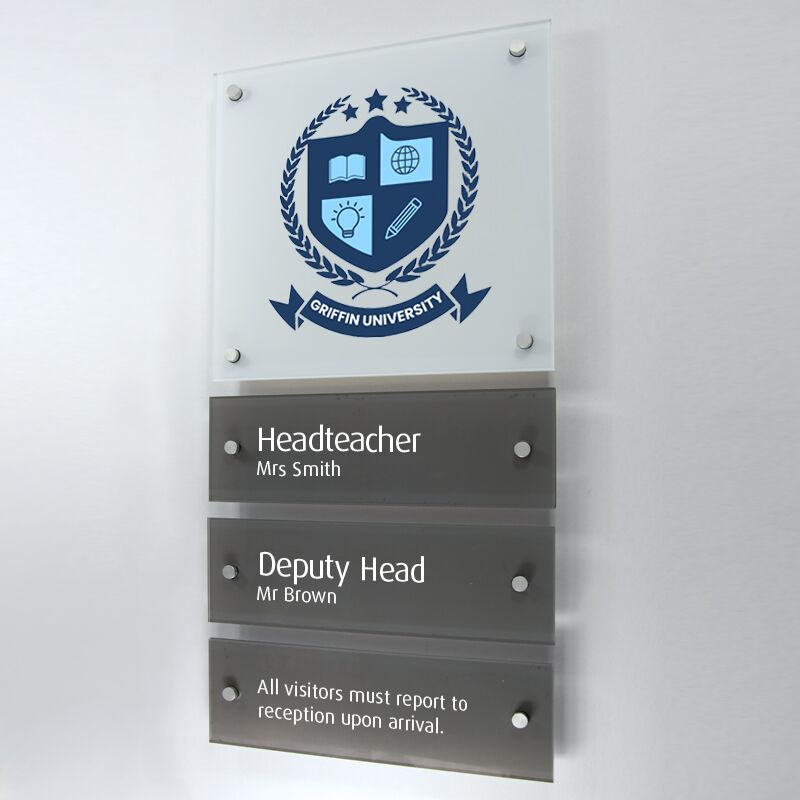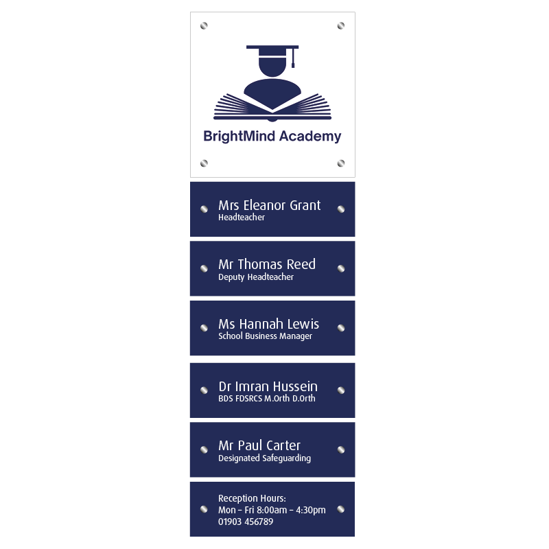 Crafted from 4 mm clear acrylic panels with satin anodised aluminium fixings, this sign is designed to clearly display staff, classroom, or office information in a professional and easy-to-read format.
