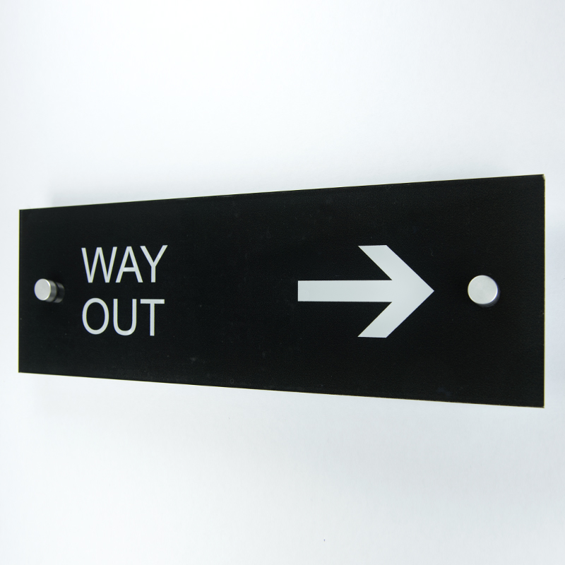 Directional signage for doors and walls made from clear acrylic with aluminium fixings. Custom arrows, icons and colours available.