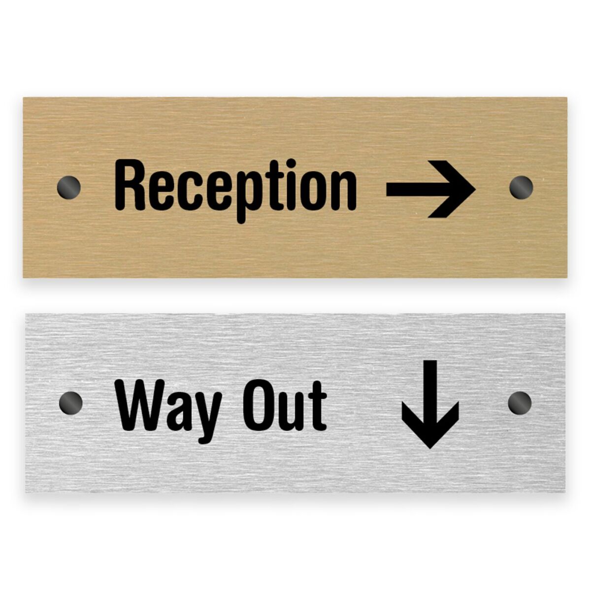 Available in silver or bronze, each sign is manufactured from a durable aluminium composite panel with crisp black vinyl lettering applied to the face. The panel is held off the wall using black anodised aluminium fixings, creating a clean, modern stand-off finish that enhances visibility and directional clarity.