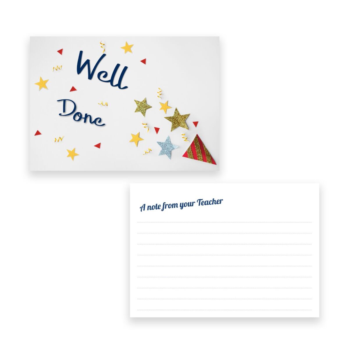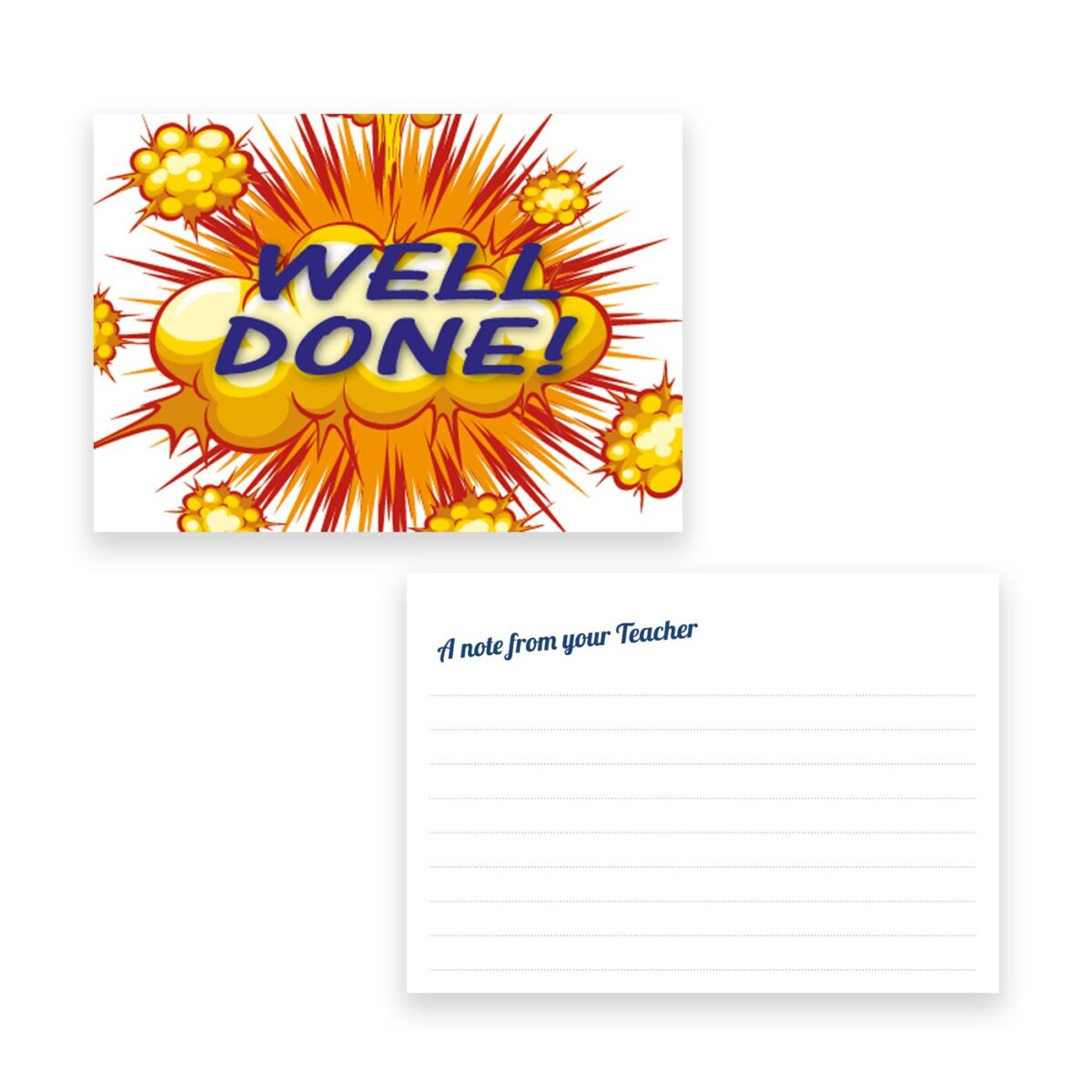 Designed specifically for schools, these postcards are ideal for rewarding pupils, recognising progress, or sharing positive messages with parents. A popular format includes a bold, celebratory design on one side (such as Well Done!) and a practical “Note from the Teacher” section on the reverse, complete with writing lines for personalised feedback. Schools can also supply their own artwork or request a bespoke design tailored to their branding, values, or reward system.